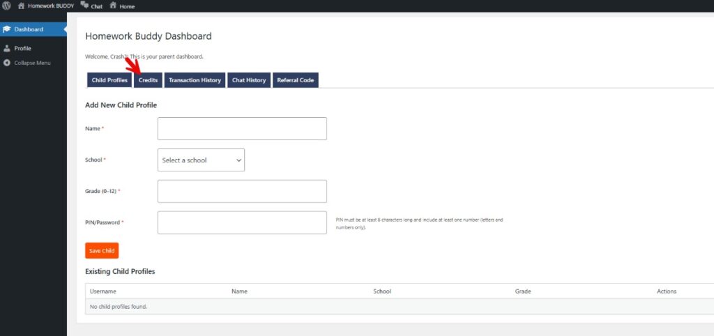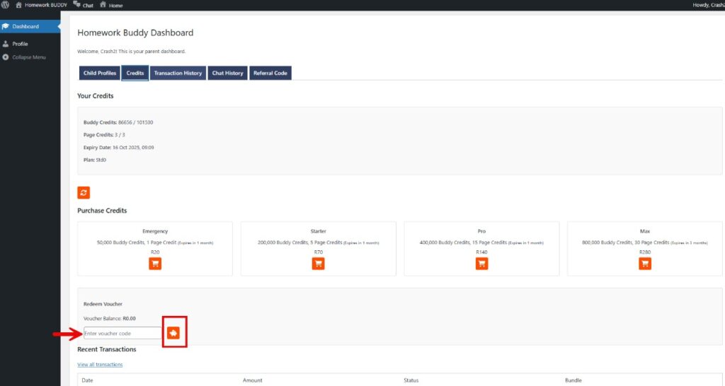 Voucher Credits can only be redeemed in the “Parent” dashboard. That would be the person that originally signed up to Homework Buddy.